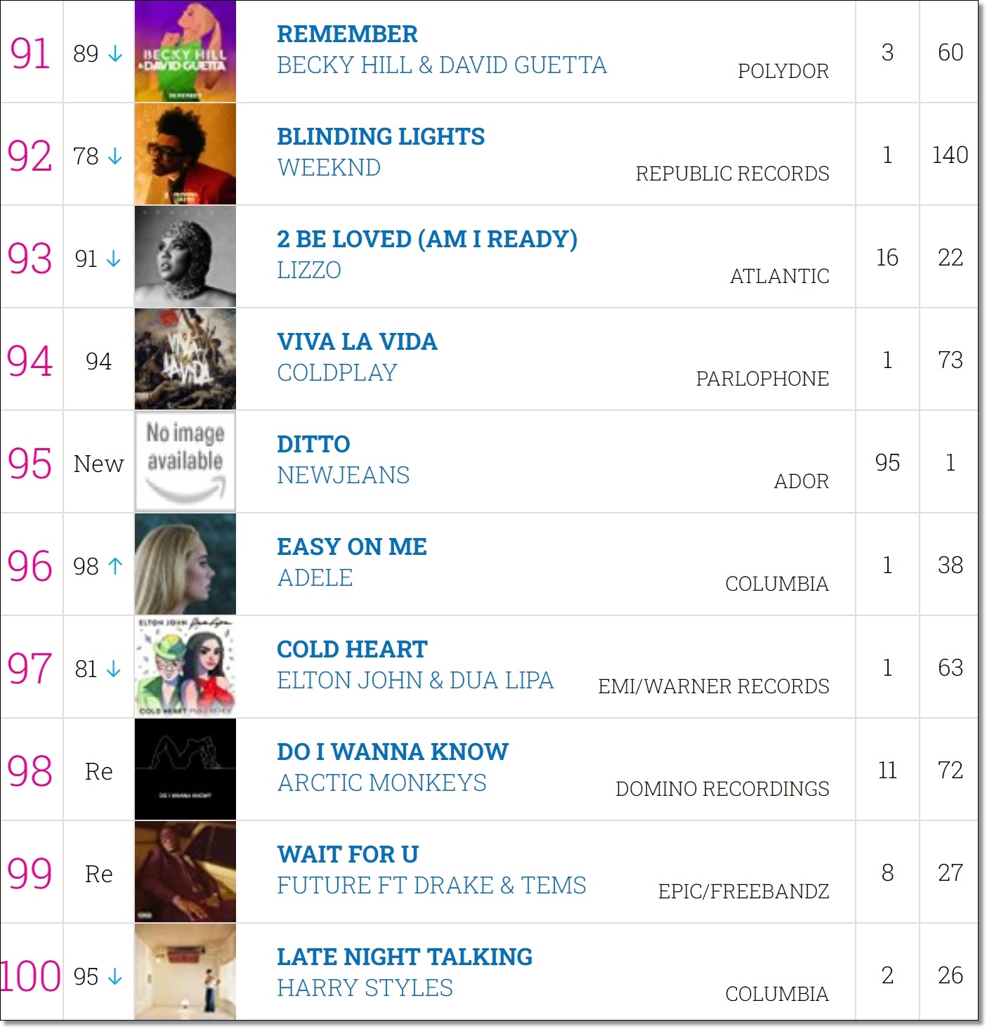 데뷔 6개월밖에 되지 않은 뉴진스(민지, 하니, 다니엘, 해린, 혜인)가 싱글 앨범OMG의 수록곡 ‘Ditto’로13일(현지시간) 발표된 영국 오피셜 싱글 톱100 차트서 95위를 기록했다.