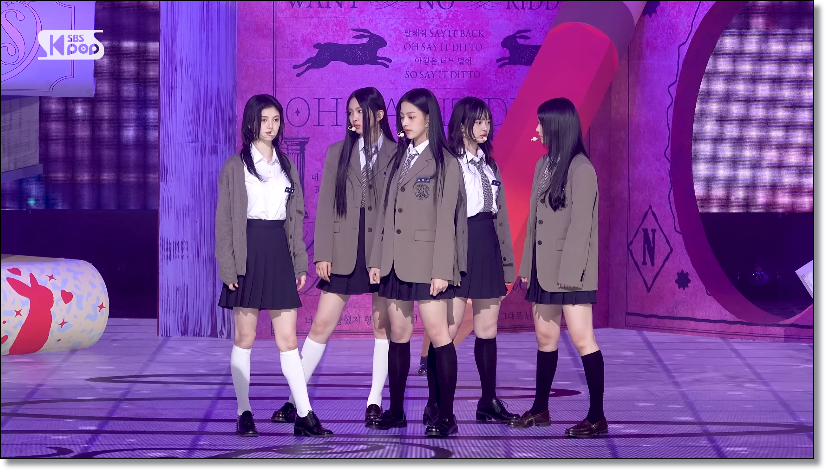 뉴진스는 이날 ‘인기가요’에서 교복 스타일의 의상을 입고 ‘Ditto’ 무대를 펼쳤고, 방송을 통해 처음 공개되는 ‘OMG’ 무대가 이어졌다.