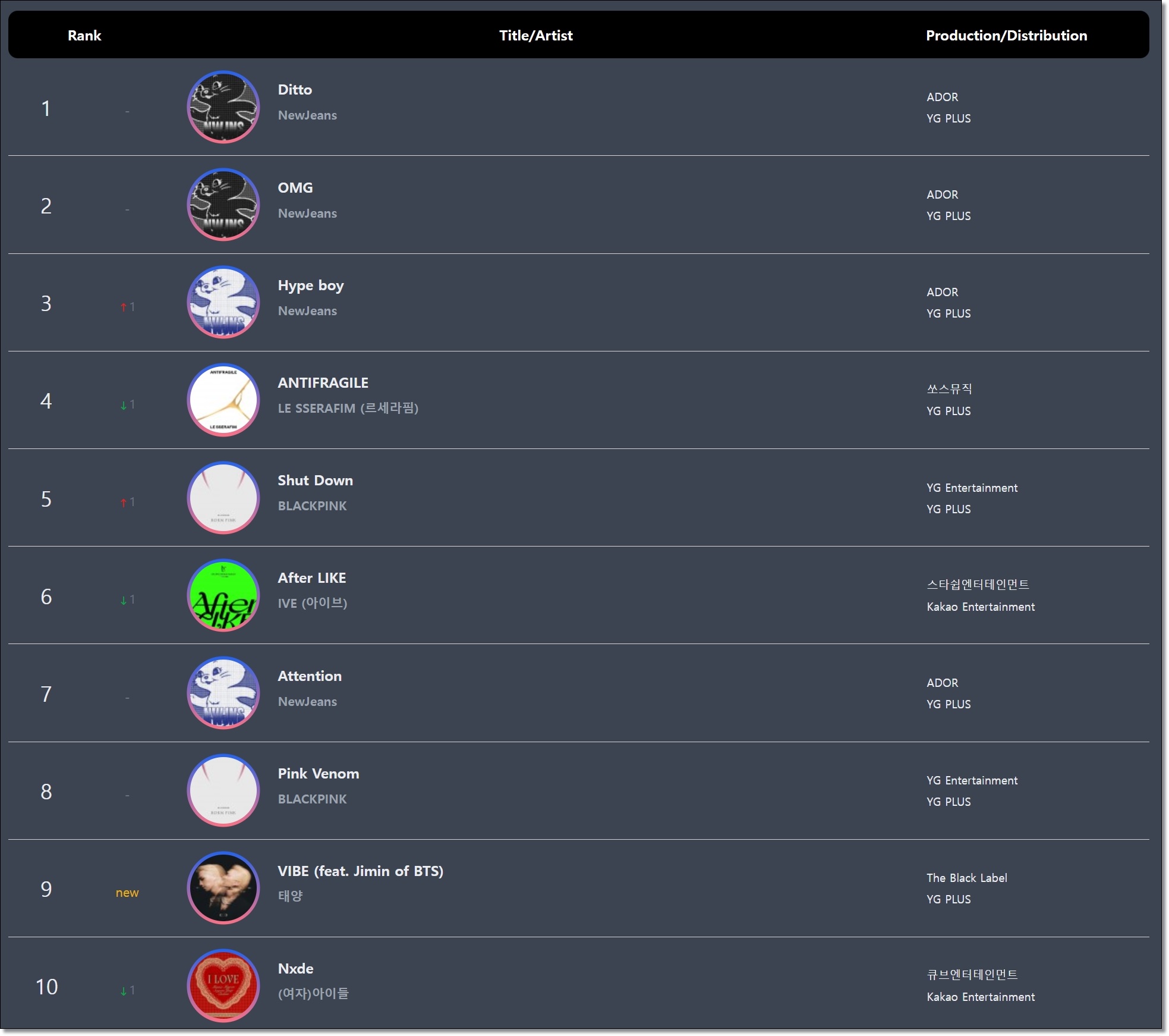 주간 글로벌 K-팝 차트에서는 싱글 앨범 ‘OMG’의 수록곡 ‘Ditto’와 동명의 타이틀곡 ‘OMG’가 나란히 1위, 2위에 랭크됐다.