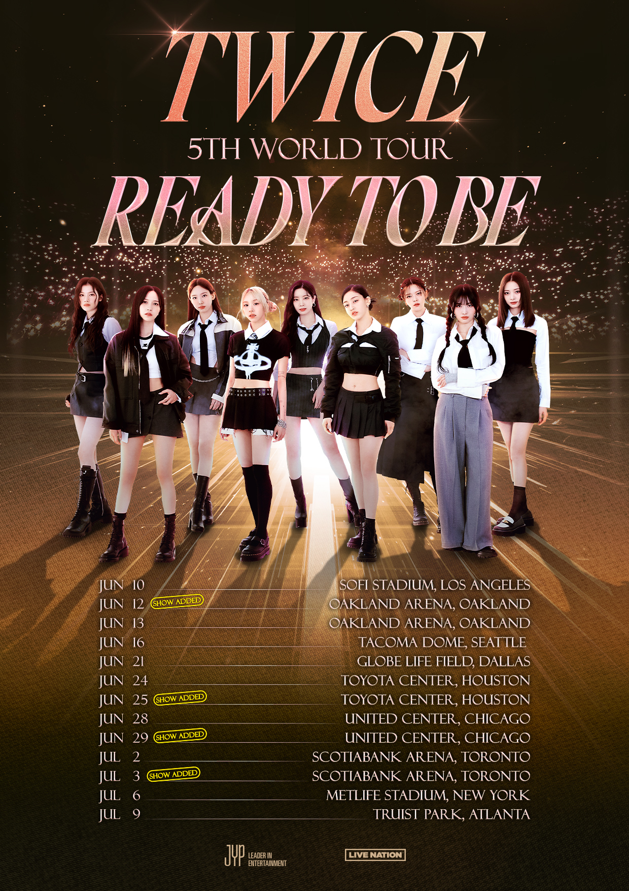- TWICE 5번째 월드투어(World Tour) 'Ready To Be'스케줄, 국가, 도시, 일정 공개 : 대한민국(서울.KSPO돔), 호주(시드니, 멜버른), 일본(오사카, 도쿄), 미국(LA, 오클랜드, 시애틀, 댈러스, 휴스턴, 시카고), 캐나다(토론토), 미국(뉴욕, 애틀란타)