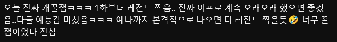 '오늘 진짜 개꿀잼, 1화부터 레전드 찍음. 진짜 이프로 계속 오래오래 했으면 좋겠음. 다들 예능감 미쳤음. 예나까지 본격적으로 나오면 더 레전드 찍을 듯. 너무 꿀잼이었다 진심'