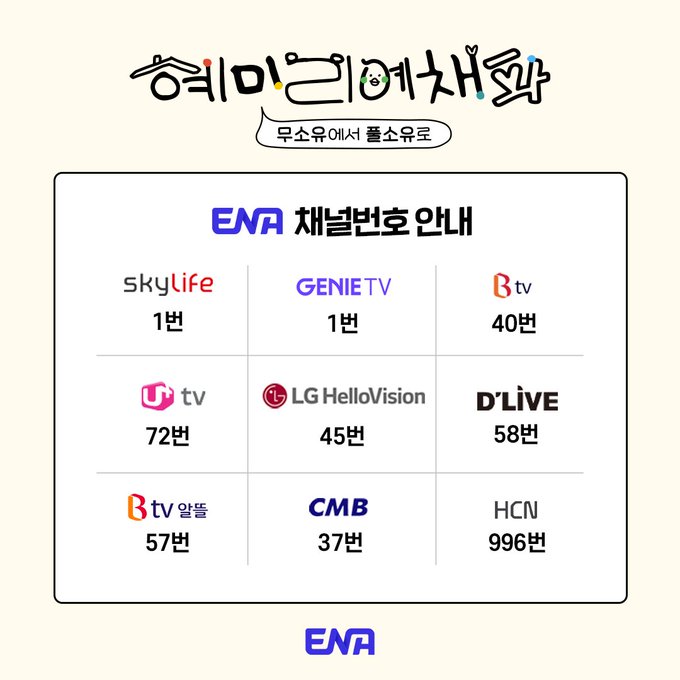 korea TV Channel ENA : main broadcast is every Sunday at 7:50pm
