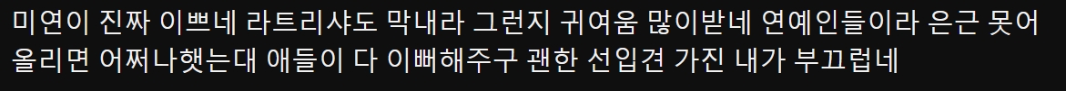 '미연이 진짜 이쁘네. 파트리샤도 막내라 그런지, 귀여움 많이 받네. 연예인들이라 은근 못 어울리면 어쩌나 했는데, 애들이 다 이뻐해주구, 괜한 선입견 가진 내가 부끄럽네'