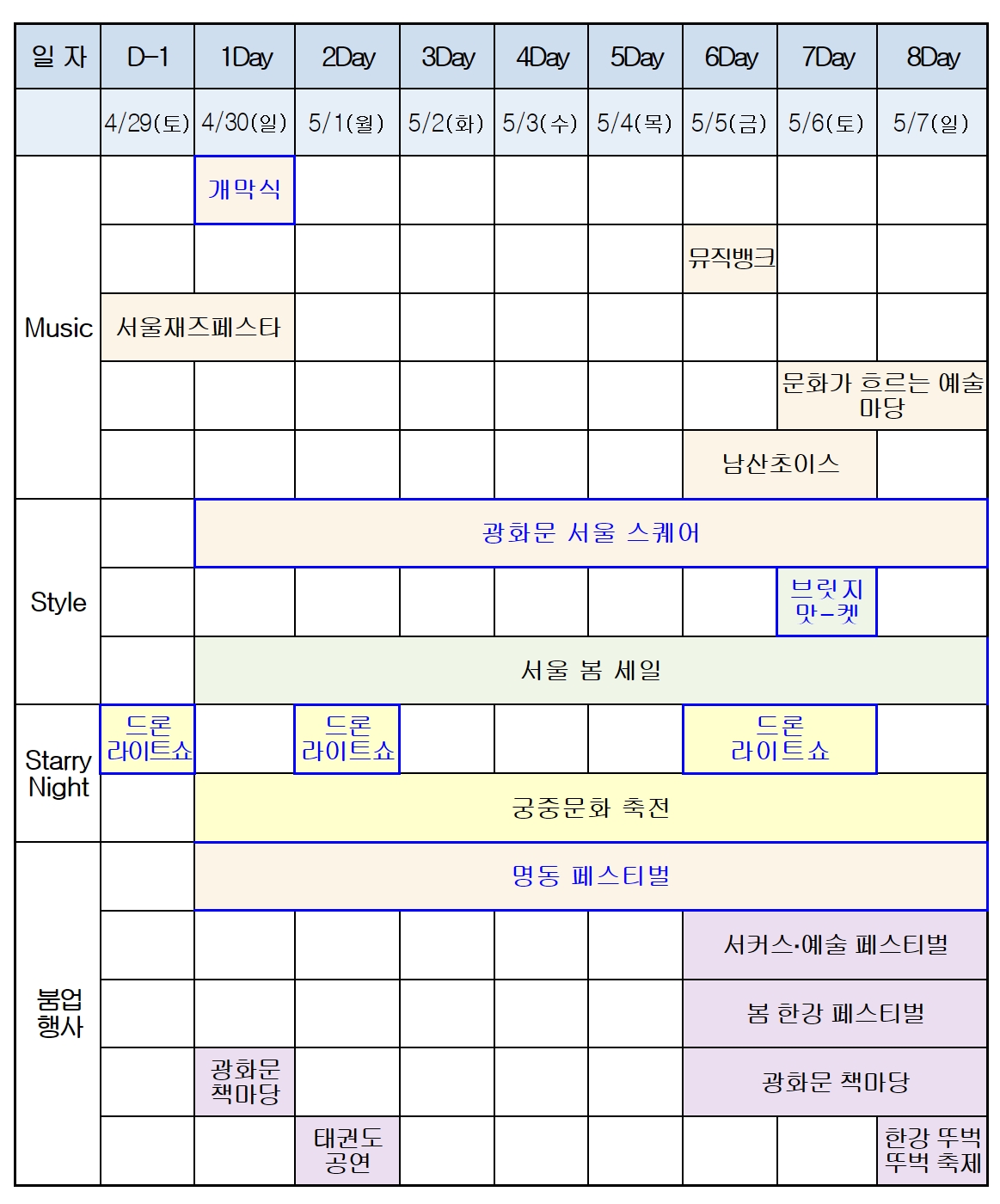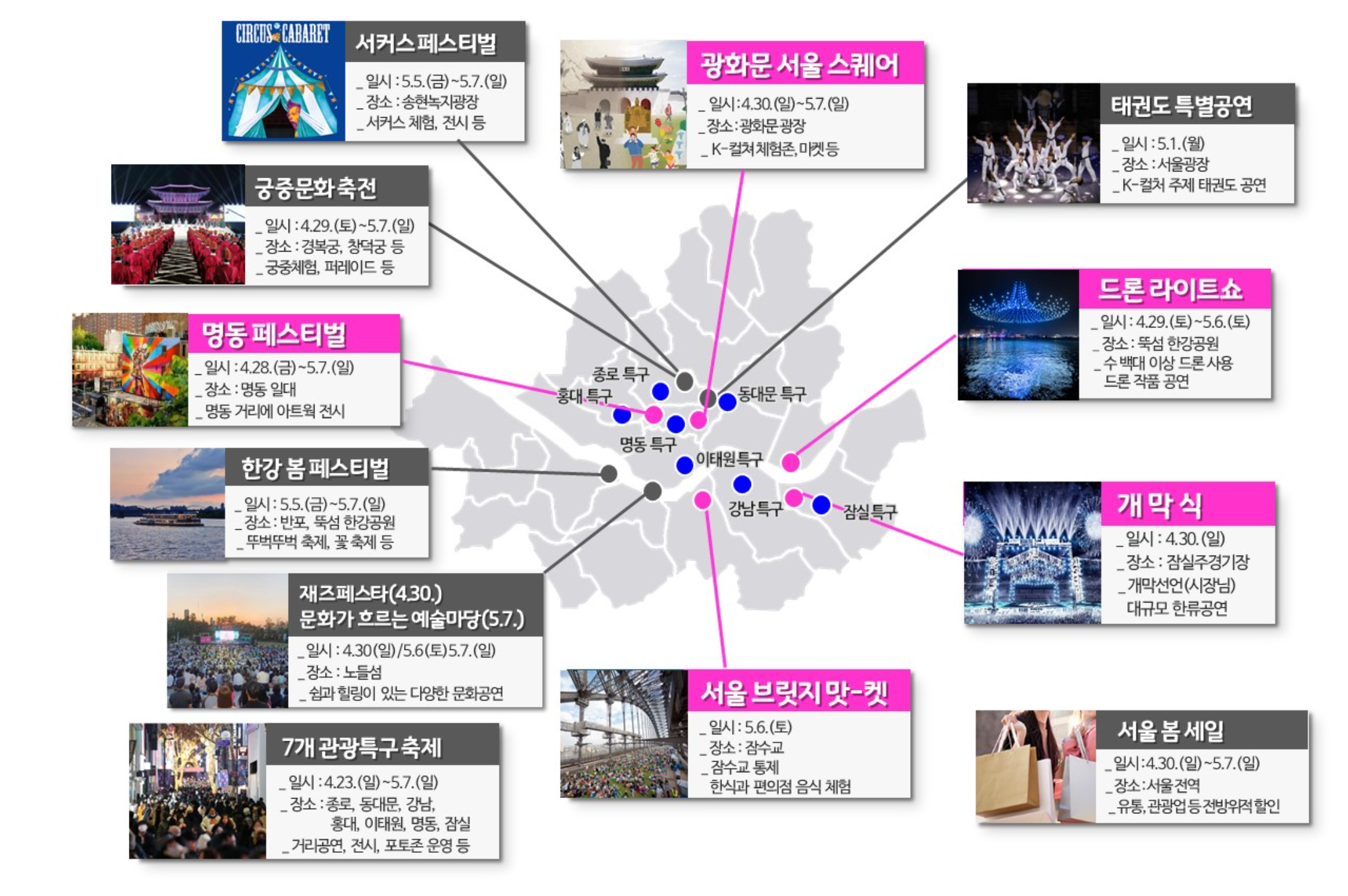 - 서울페스타 행사기간 : 4.30.(일)~5.7.(일) 8일간 서울 전역, K-팝·K-스타일·야경‧미식 축제