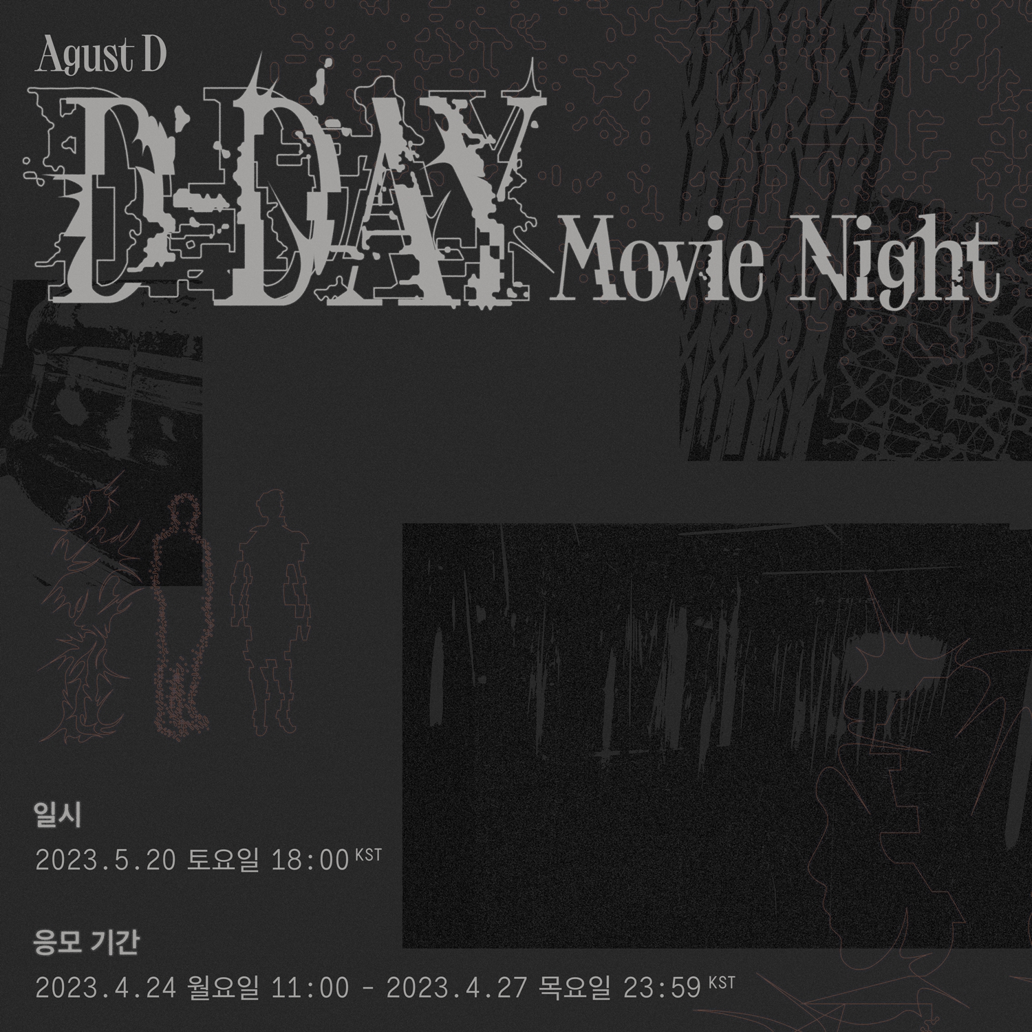 플랫폼 위버스(Weverse)를 통해 활동명 Agust D로 발표한 솔로 앨범 'D-DAY' 발매 기념 팬 이벤트 'D-DAY: Movie Night'의 개최 소식을 전하며, 'D-DAY: Movie Night'(디데이 : 무비 나이트)는 350명의 팬과 함께하는 대면 이벤트로, 오는 5월 20일 서울에서 펼쳐질 예정이다.