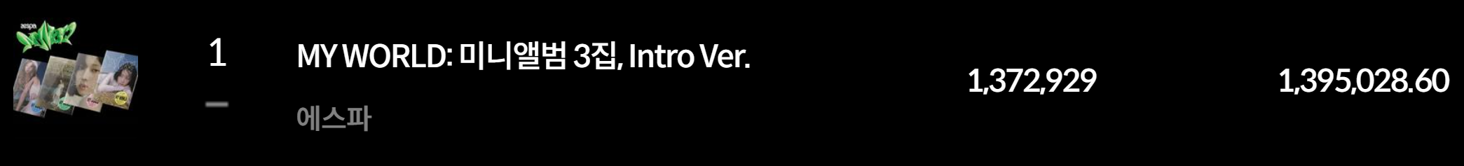 5월 8일 발매 된 에스파의 세 번째 미니앨범 MY WORLD는 선주문 수량만 총 180만장(5월 8일 기준)으로, 두 번째 미니앨범인 Girls(걸스)의 선주문량인 161만장을 넘어 자체 최고 기록을 경신했다.