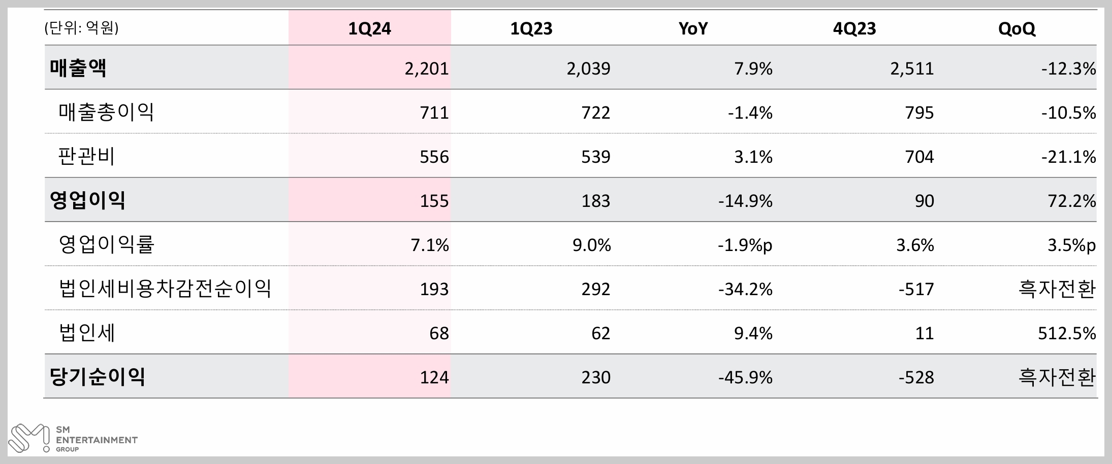 SM엔터테인먼트(대표: 장철혁, 탁영준 / 모기업 카카오)가 24년 1분기 연결기준 매출 2,201억원, 영업이익 155억 원, 당기순이익 124억 원을 기록했으며, 매출이 전년 동기 대비 7.9% 증가했다고 공시했다.