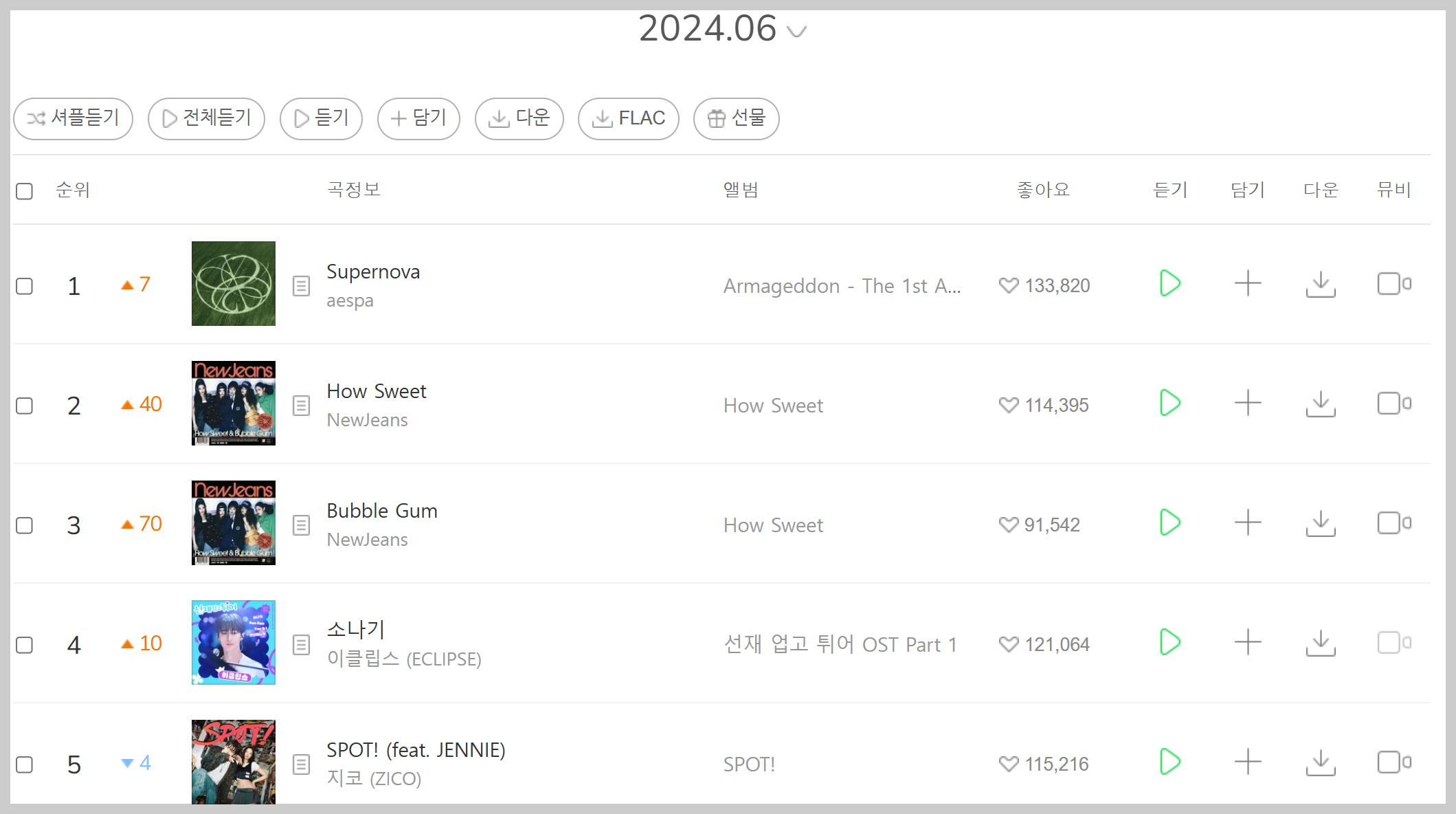 에스파 국내 음원 차트 장기 차트인, 수퍼노바 6주 연속 주간 1위